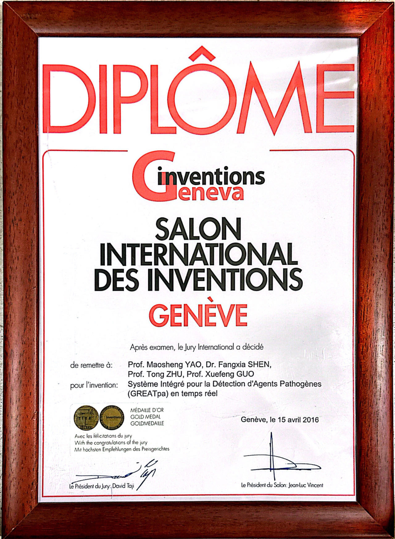 During the 44th International Exhibition of Inventions of Geneva held in Geneva, Dr. Yao along with his colleagues won the Gold Medal with the congratulations of the jury. The exhibition has attracted 695 participants from 40 countries exhibiting around 1000 inventions. Details about the exhibition can be found at http://www.inventions-geneva.ch/images/pdf/EN2016-SCoPresFinal.pdf